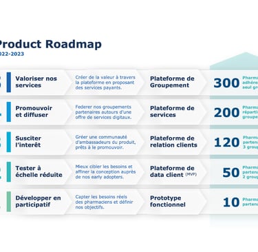 Product Roadmap : Plan d’évolution du produit avec les grandes étapes de développement et les jalons clés.